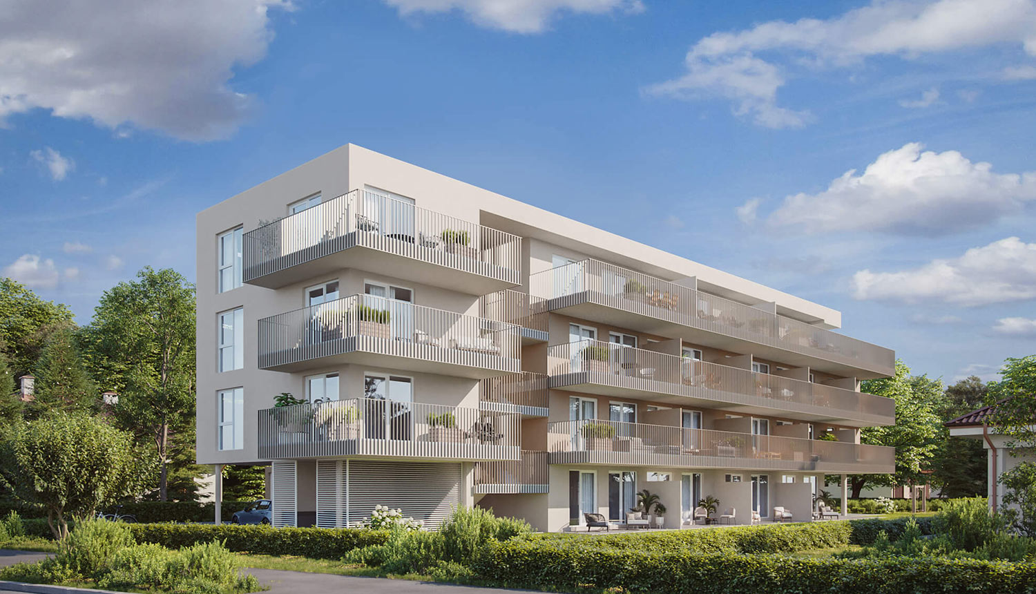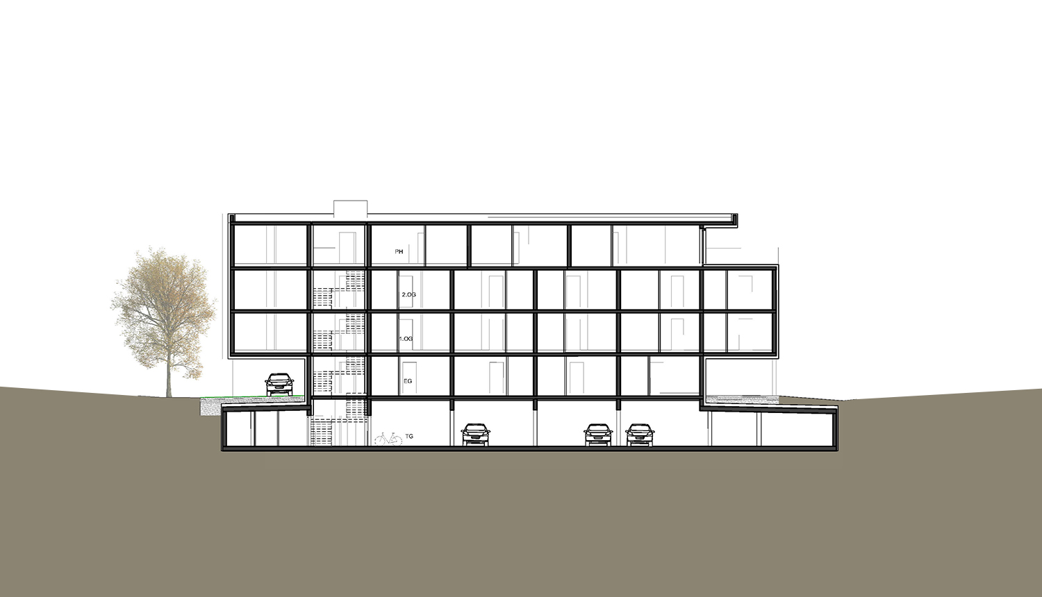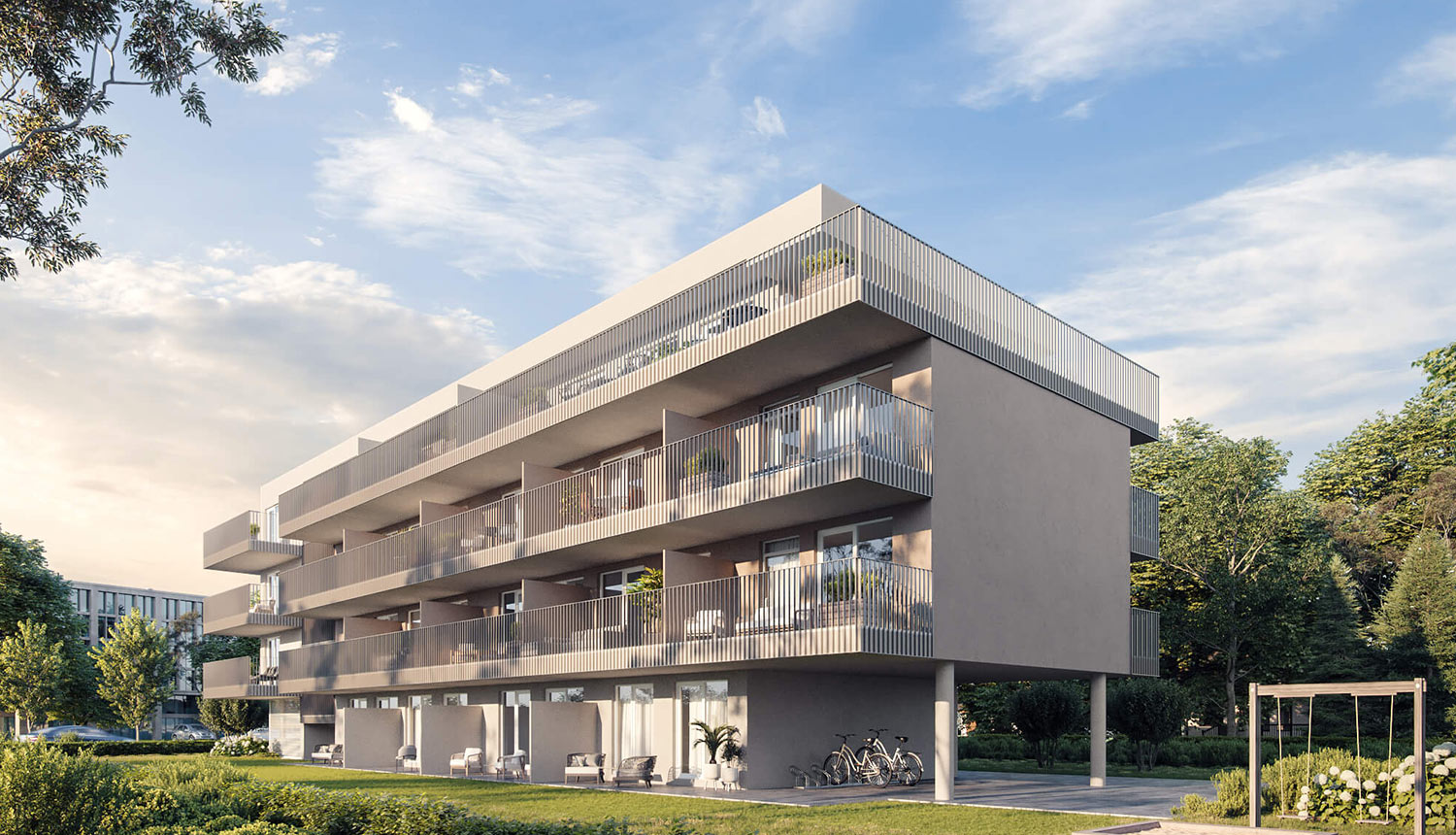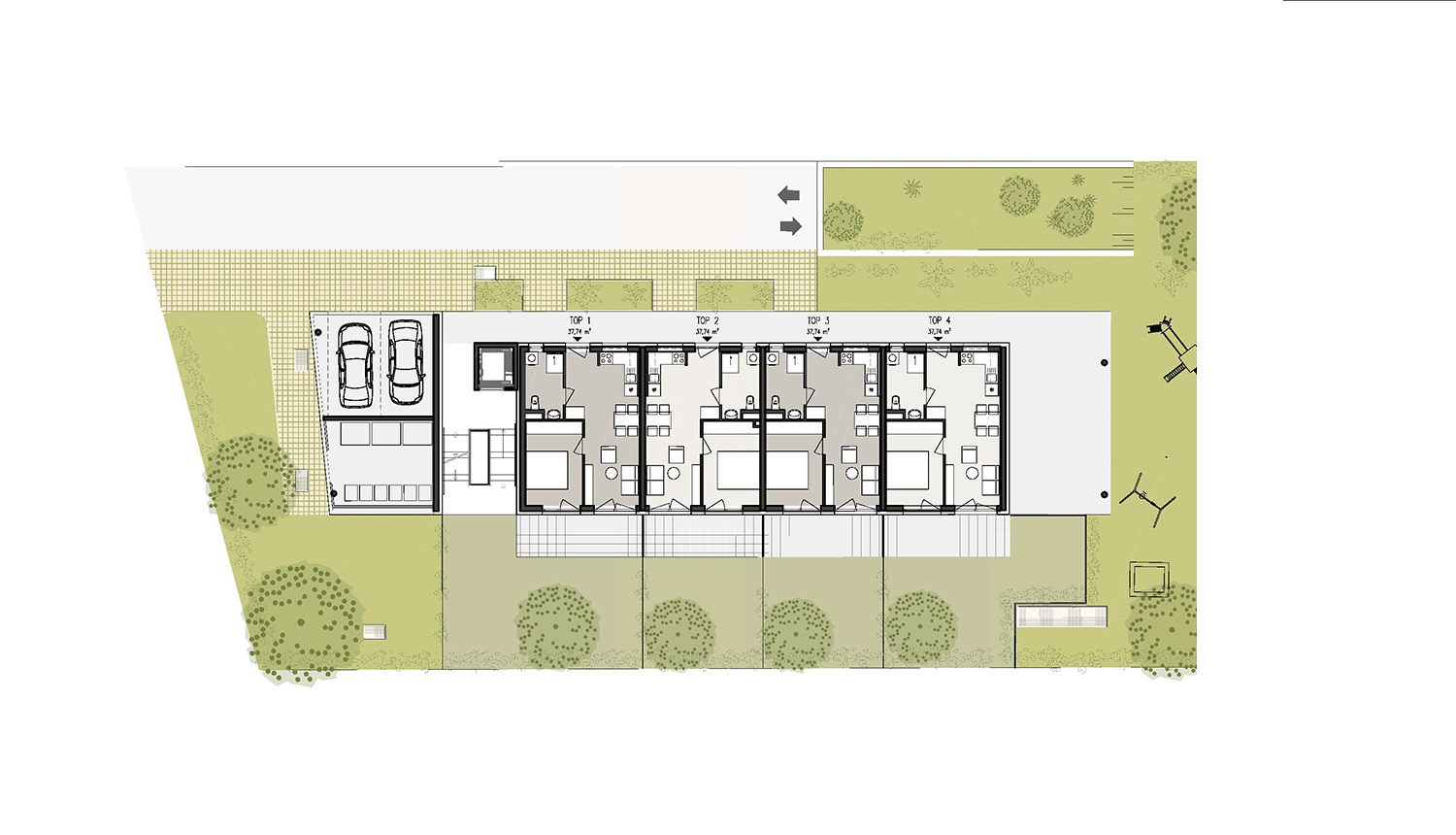 Oberirdisch befinden sich zwei in das Gebäude integrierte Besucherparkplätze, die restlichen Stellplätze werden in einer Tiefgarage untergebracht. Somit bleibt der Großteil des Grundstücks autofrei, was zusammen mit der zentralen Lage des Gebäudes großzügige Freibereiche rund um den Baukörper schafft – für die Erdgeschosswohnungen Privatgärten sowie Gemeinschaftsbereiche mit einem Kinderspielplatz im autofreien geschützten Bereich des Grundstücks.