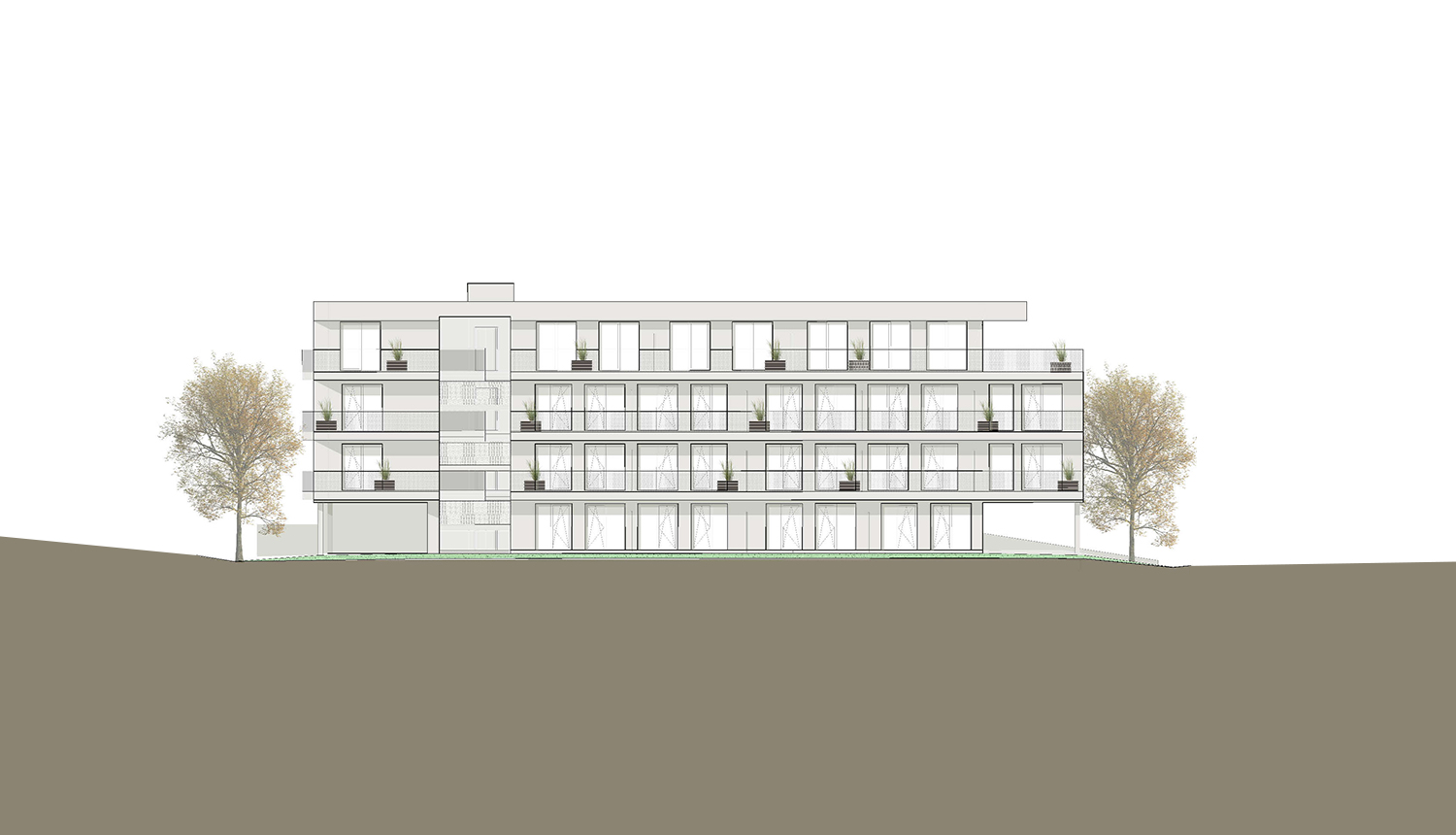 Für den Entwurf wurde das Charakteristikum der benachbarten Strukturen als offene Bebauung aufgegriffen. Dies ermöglicht nicht nur die Abschirmung vor Straßenlärm, sondern vor allem auch eine optimale Ausrichtung der Wohnungen nach Süden mit ungestörtem Blick in den eigenen Grünraum. Der Entwurf sieht einen dreigeschossigen Baukörper mit einem rückversetzten Dachgeschoss vor, der orthogonal zur Straßganger Straße positioniert ist. Dadurch entsteht eine Verbindung zwischen der kleinteiligen Baustruktur im Osten und der massiven Struktur im Westen. Die Abwendung von der Straße ermöglicht den Wohnungen eine gute, lärmfreie und ungestörte Beziehung zum Freiraum mit bester Belichtung und Besonnung.