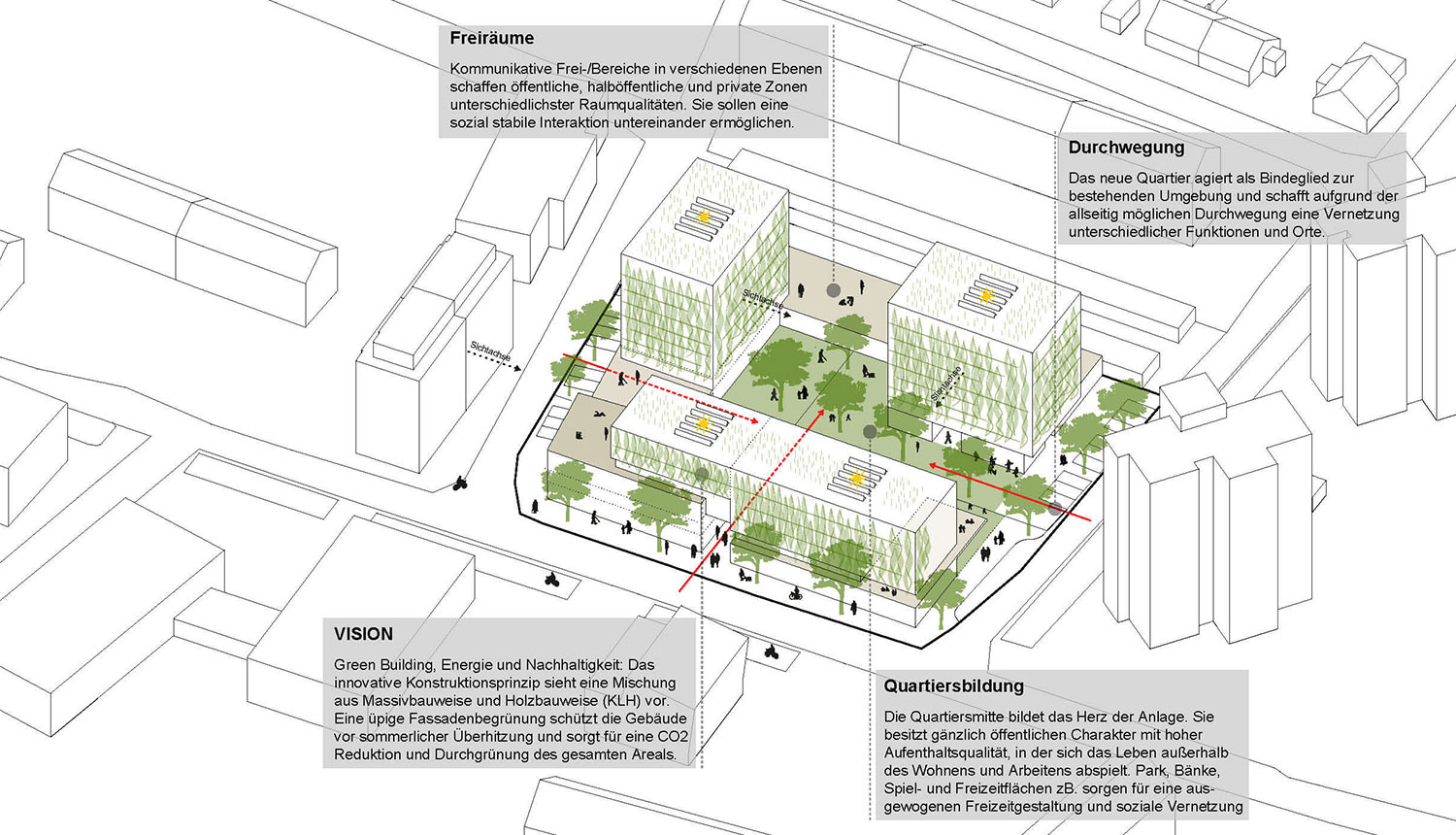 Während die Erweiterung des Innovationszentrums W.E.I.Z als lokale, regionale und internationale Anlaufstelle für Forschung, Bildung und Wirtschaft im Fokus liegt, spielen die Errichtung einer Kinderbetreuungseinrichtung sowie Wohn- und Büroflächen eine wesentliche Rolle in der Konzeptgestaltung. Auf Grund des urbanen Kontextes sowie seiner hohen Anzahl an angrenzenden Wohnbauten schien es erforderlich, die Wohnquartiere der Siedlungsgenossenschaften so zu situieren, so dass eine bestmögliche Wohnqualität geschaffen wird.