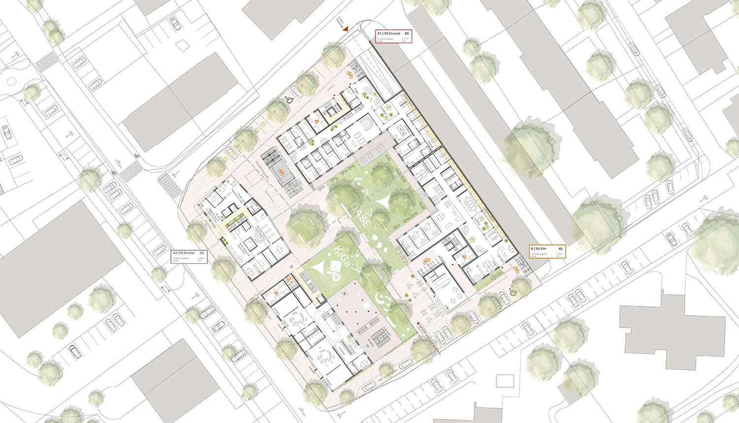 Das Grünraumangebot findet primär auf zwei Ebenen statt. Der Park versteht sich in erster Linie als intensive Begegnungszone. Differenzierte Zonierung und individuelle Gestaltung einzelner Bereiche (Boccia) definieren die Aufenthaltsqualität im Außenraum. Die Grünspange am Dach dient den beiden Wohnbauten und der Wohngemeinschaft als gemeinsamer Garten und kann durch individuelle Gebrauchnahme ein eigenständiges Milieu aufgebaut werden.