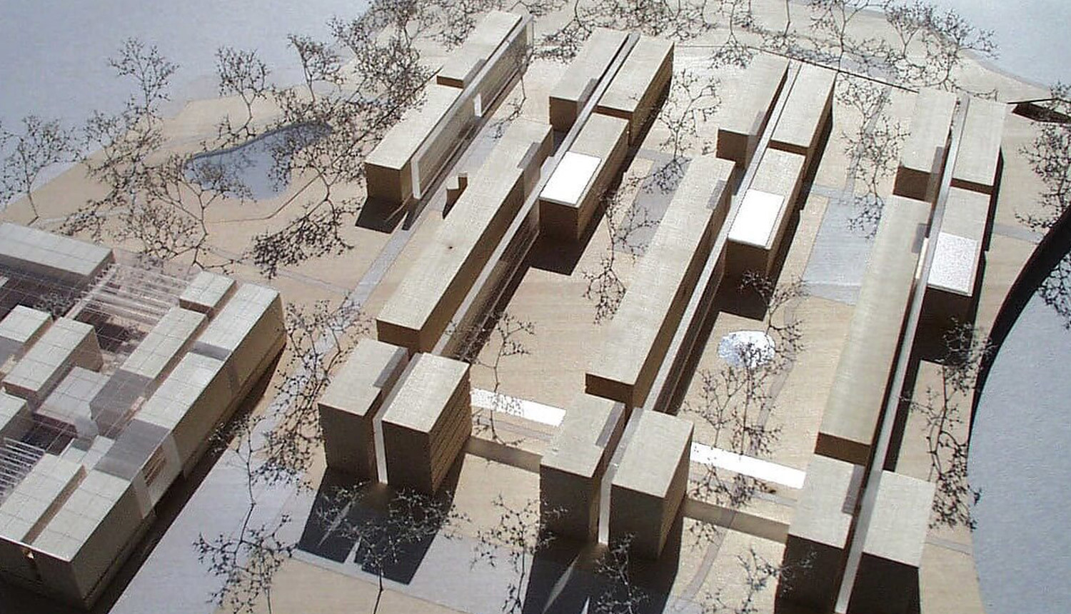 Besonderes Augenmerk wurde beim Entwurfskonzept der Wohnanlage auf ein schlüssiges Außenraumkonzept gelegt. Die freie Anordnung der Zeilen und deren Versetzung zueinander ermöglichen ein differenziertes Angebot von Außenräumen, deren Konfiguration und Stimmung einen wesentlichen Bestandteil des städtebaulichen Konzeptes darstellen. Im Kontrast dazu verzichtet das Pflegeheim bewusst auf eine Verzahnung zum Naturraum und fokussiert sich primär auf die urbane Struktur innerhalb des Gebäudekomplexes.