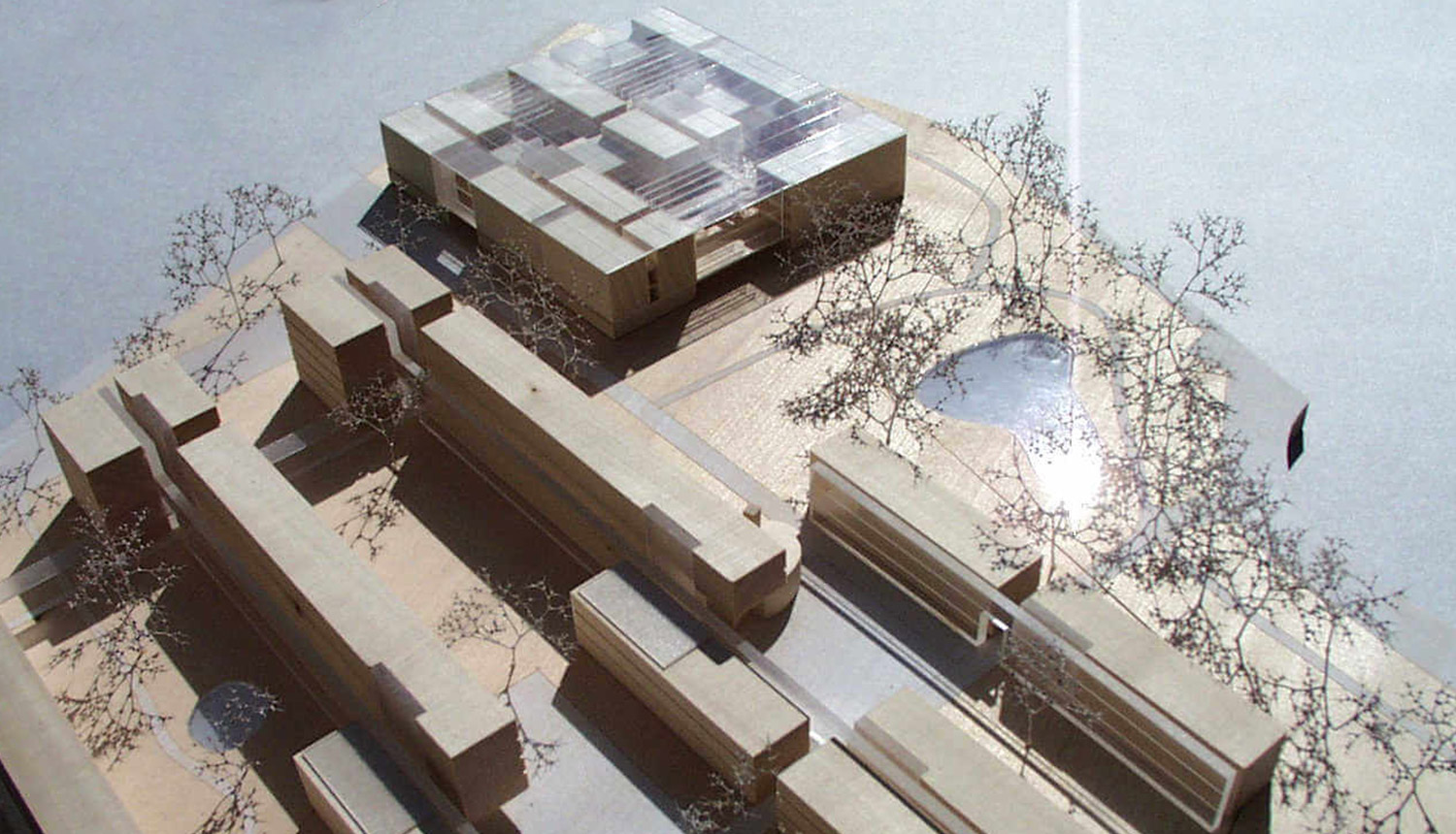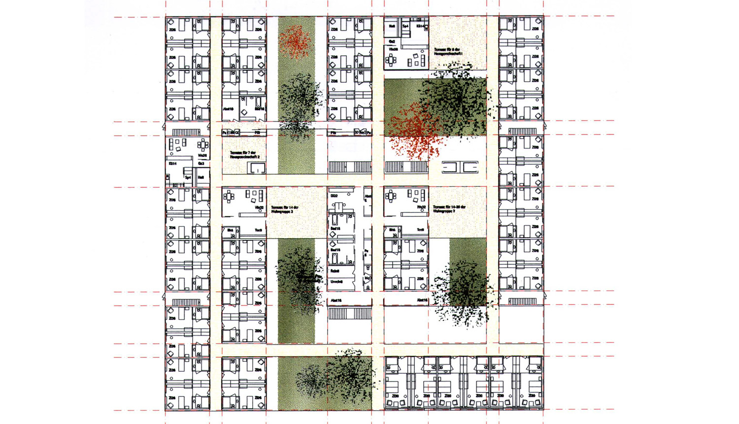 Die klare Struktur der Wohnanlage mit den rhythmisch angeordneten Zeilen steht im reizvollen Kontrast zum Quadrat des Pflegeheimes. Die Schlichtheit der Baukörper überlässt dem Erlebnis des Naturraumes den Vortritt. Die Durchlässigkeit der Zeilen öffnet die Anlage zum Straßenraum und verbindet den grünen Vorplatz im Norden mit dem Garten im Süden.