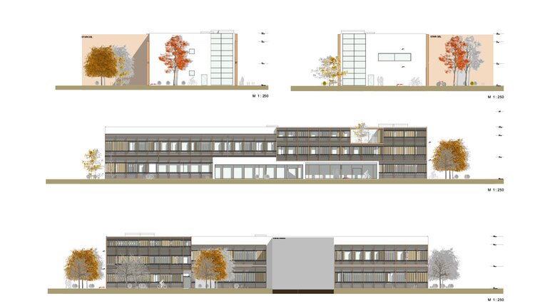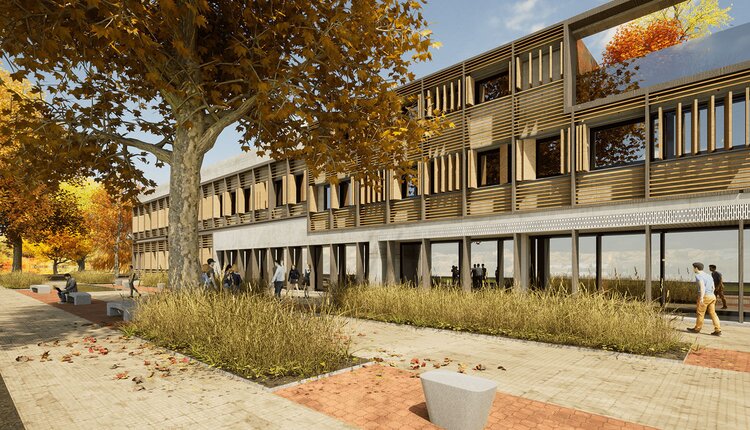 Die Universität wird durch einen im Westen situierten Baukörper ergänzt, der den H-förmigen Grundriss samt angrenzenden Riegeln des Bestandsgebäudes aufnimmt und diesen städtebaulich komplettiert. Dadurch entsteht ein offen strukturierter Gebäudekomplex. Mittels der gewählten Kubatur entstehen hofbildende Flächen, die nicht nur qualitative Außenräume mit offenem und halboffenem Charakter darstellen, sondern auch das Ineinanderfließen von Architektur und Natur unterstreichen. Darüber hinaus erstreckt sich dieser landschaftliche Gedanke nach Westen in Form von Grünstreifen, die Freiräume für soziale Interaktionen und unter anderem Orte der Zukunft schaffen.