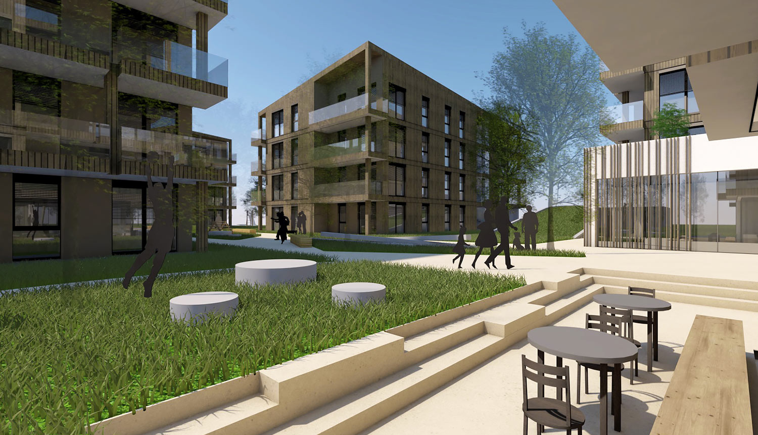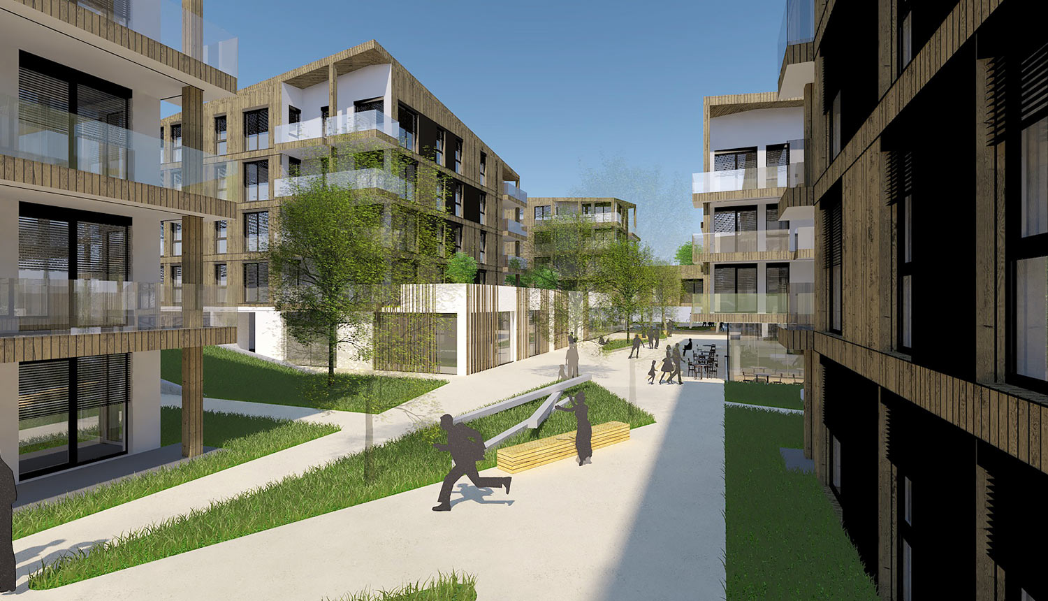 Dieser Konzeption folgend wurden die beiden östlichen Baukörper platzbildend durch eine Spange verbunden, sodass eine Torsituation zur Gesamtanlage entsteht. Da das Wesen der offenen Bebauung am besten die Ambition einer ungestörten Sichtverbindung zwischen Wohnraum und Grünraum ermöglicht, wurde diese Typologie forciert und die einzelnen Wohngebäude monolithisch in den Grünraum gestellt. Dieses Konzept ermöglicht darüber hinaus den klimatischen Vorteil einer guten Durchlüftung der Gesamtanlage.
