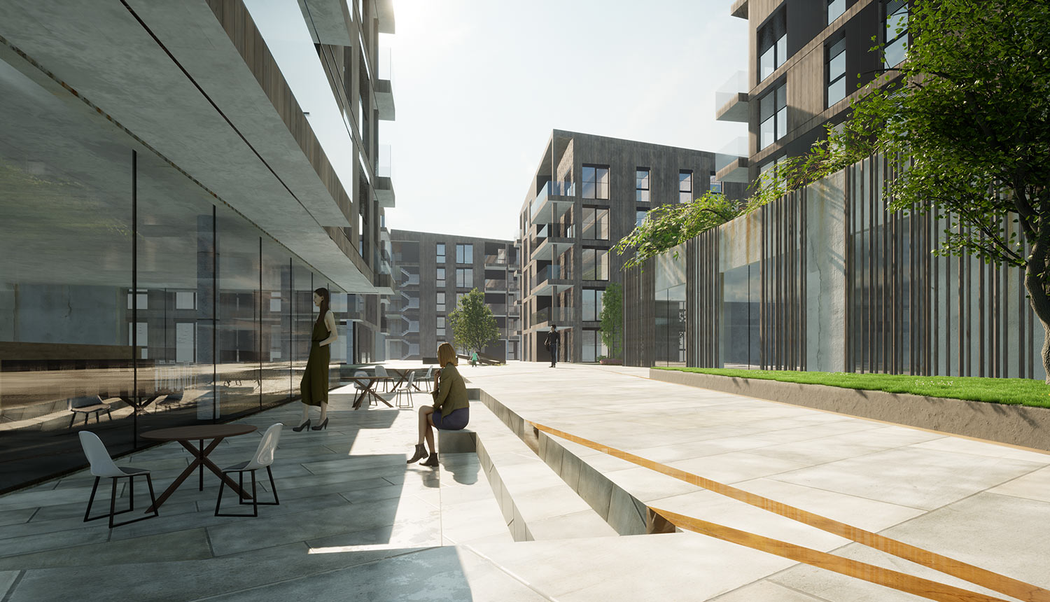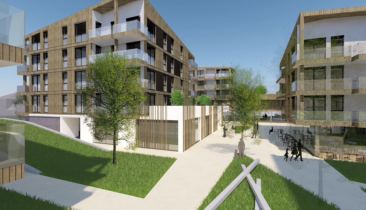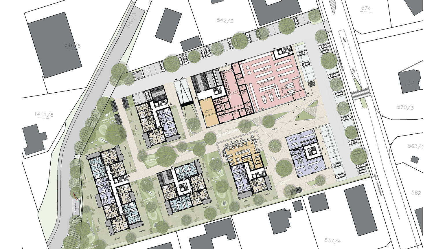 Im Sinne einer urbanen Aufwertung wurden Außenräume unterschiedlicher Qualität entwickelt. Während die Piazza zwischen Spar und Apotheke durch die Allee vom Straßenraum abgeschottet und mit dem Café den öffentlichen Teil als Entree und Begegnungszone bildet, formt die Green Lane die zentrale Achse des eher privaten Teils der Wohnanlage. Durch das Wechselspiel der versetzten Baukörper ergeben sich Außenräume unterschiedlicher Qualität und Stimmung, von privaten Gärten über gemeinsame Parkanlagen bis hin zum öffentlichen Platz im Osten der Gesamtanlage. Das Café, bewusst mittig platziert mit seinem Gastgarten, bildet das Bindeglied zwischen öffentlich und privat.
