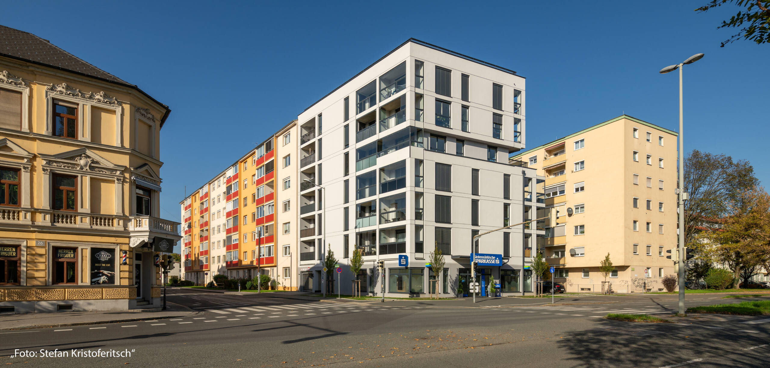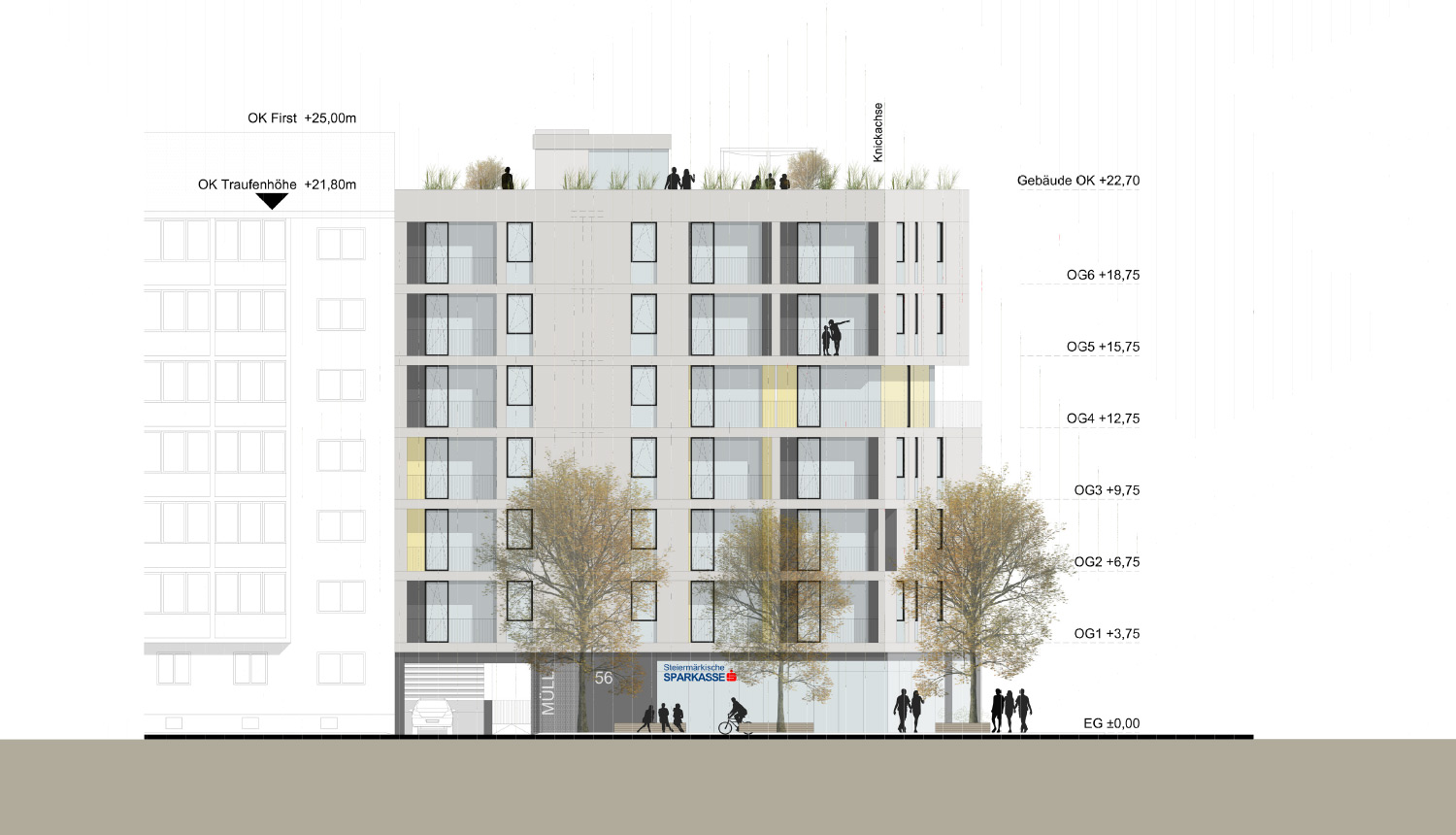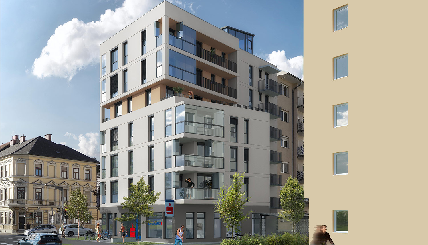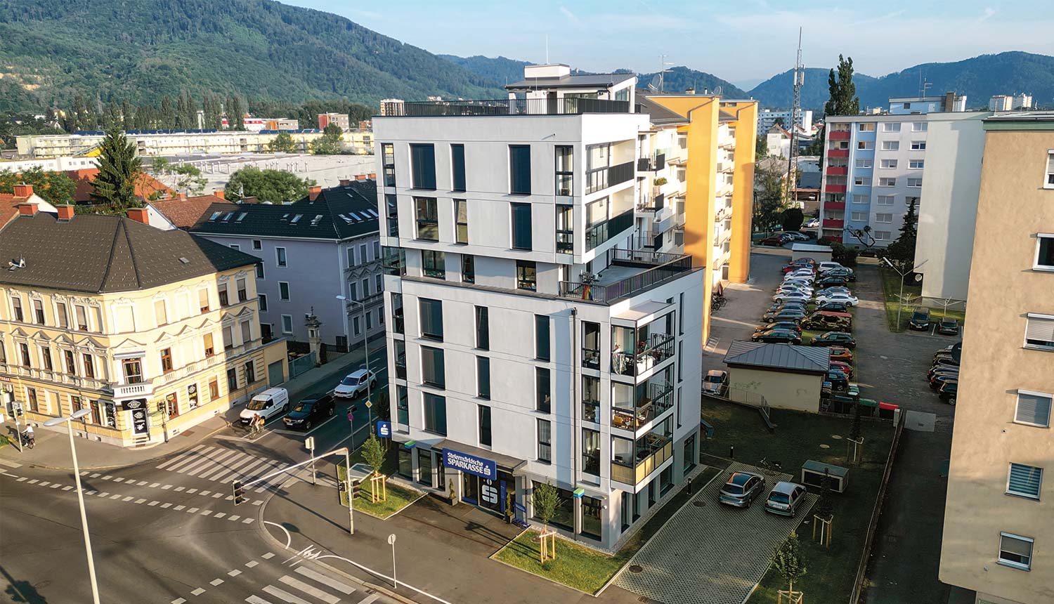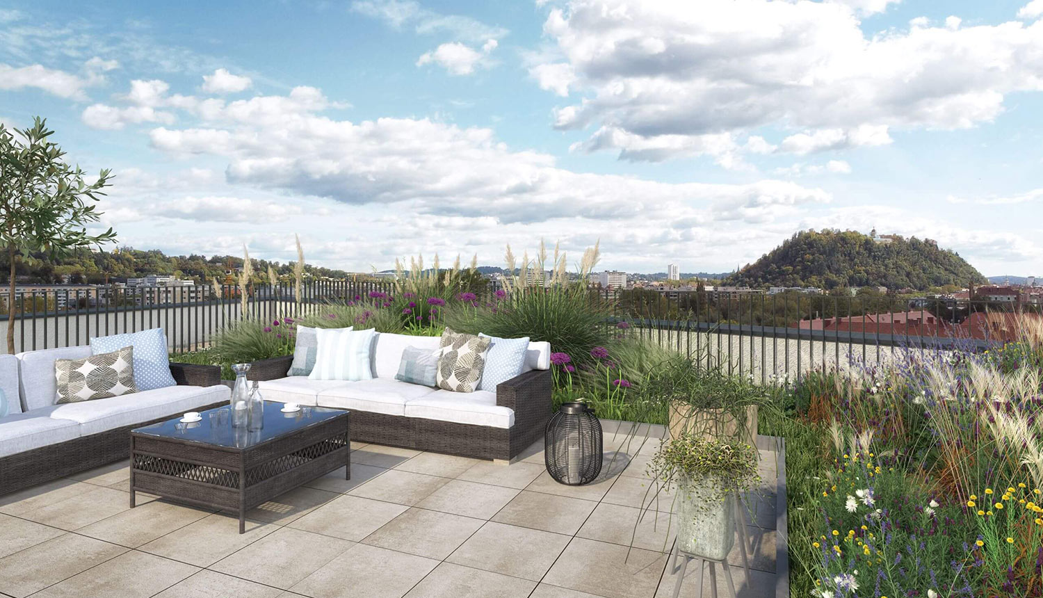 Bei der Planung wurde unter anderem auch hoher Wert auf die Freiraumgestaltung gelegt, weshalb Loggien, Balkone sowie Terrassen qualitative Aufenthaltsmöglichkeiten bieten und dadurch ergänzend den gesellschaftlichen Zusammenhalt fördern. Besonderes Augenmerk wird auf die begrünte Dachterrasse gelegt, da sie neben ihrer Funktion als Erholungsoase und Meeting Point für den sozialen Austausch auch einen prächtigen Blick auf den Schlossberg gewährt und somit eine stimmungsvolle Atmosphäre erzeugt.