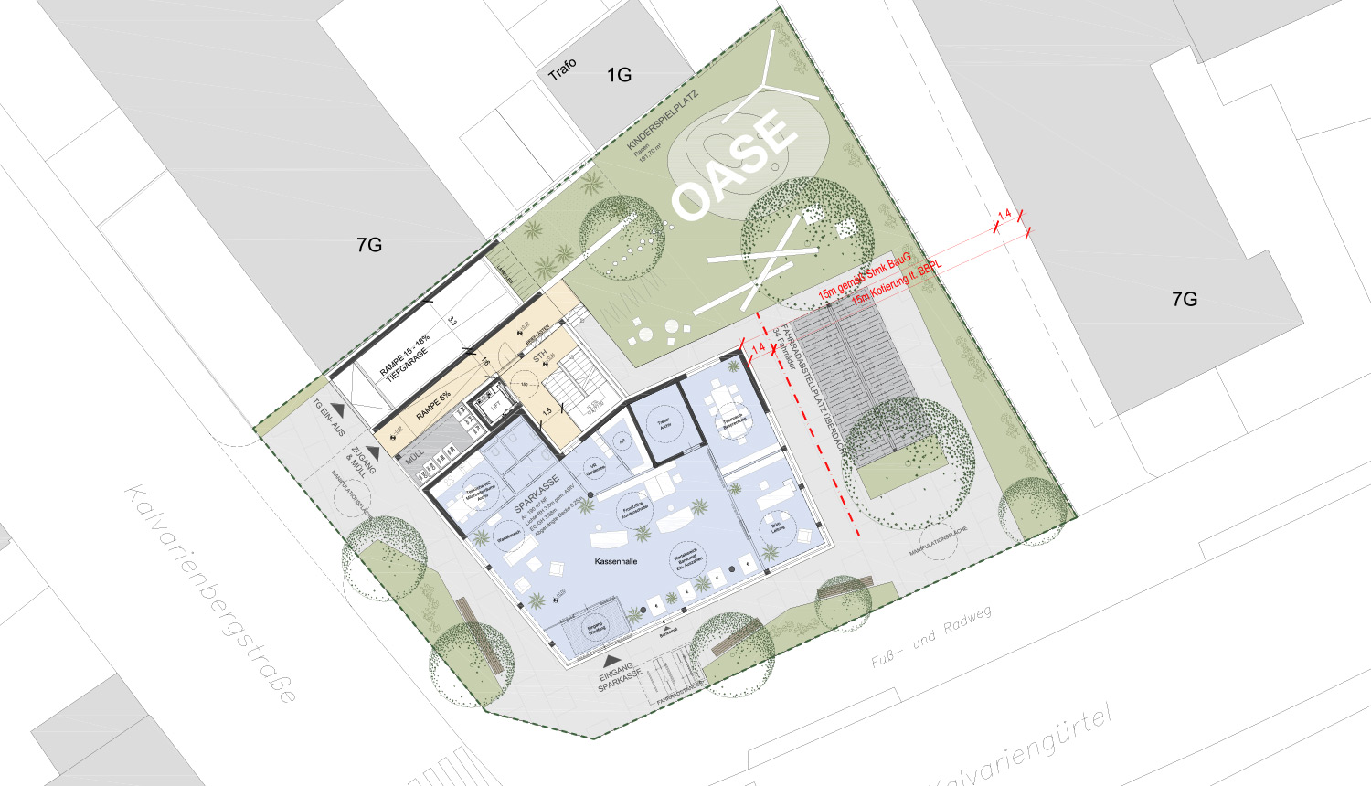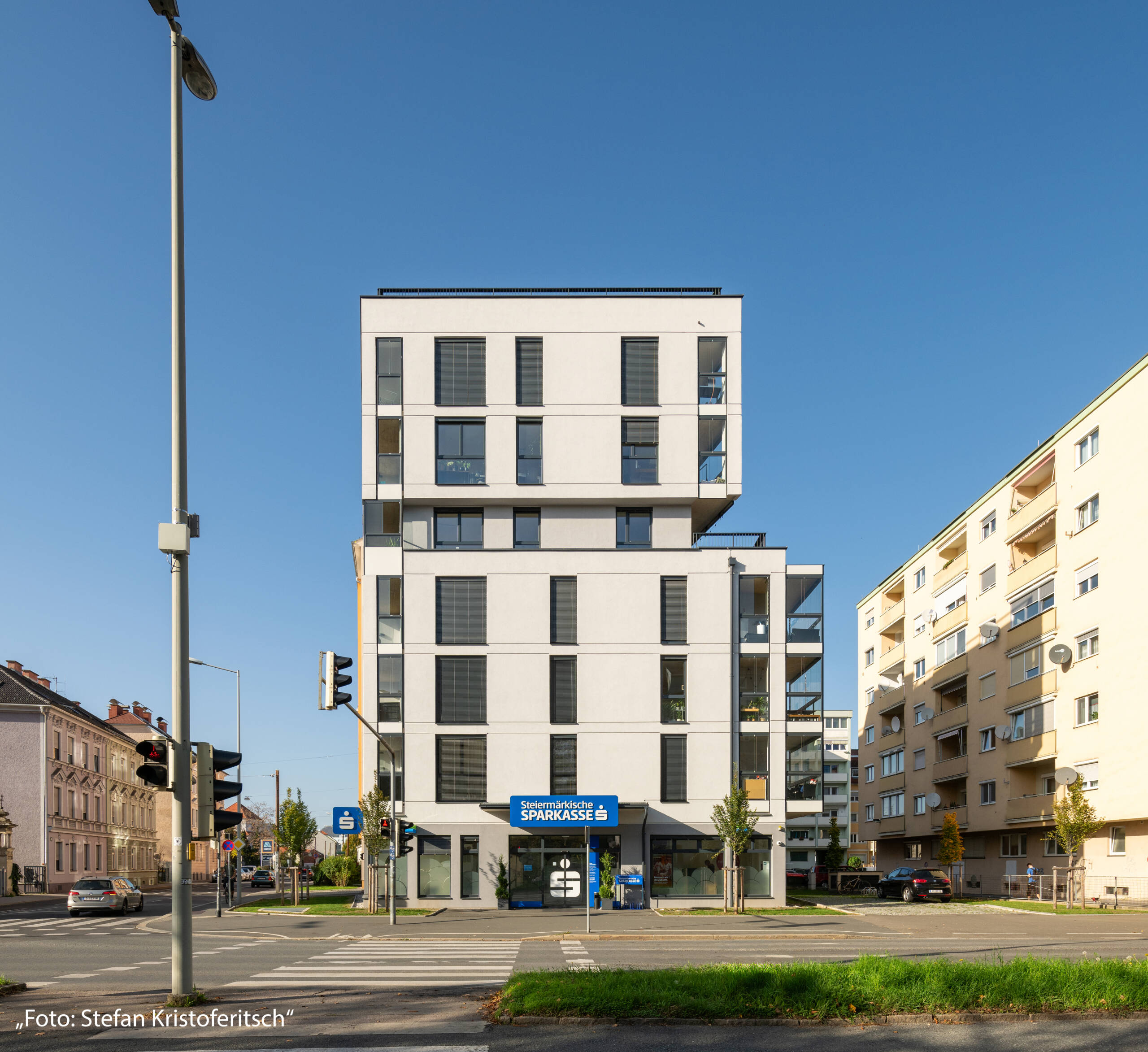 Darauf basierend erhebt sich ein kompakter, mehrgeschossiger Geschäfts- und Wohnbau, der an die Brandmauer eines der anschließenden Objekte der Kalvarienbergstraße andockt und in polygonaler Bauform die Ecke zum Kalvariengürtel aufnimmt.