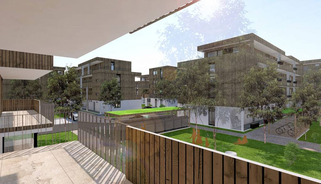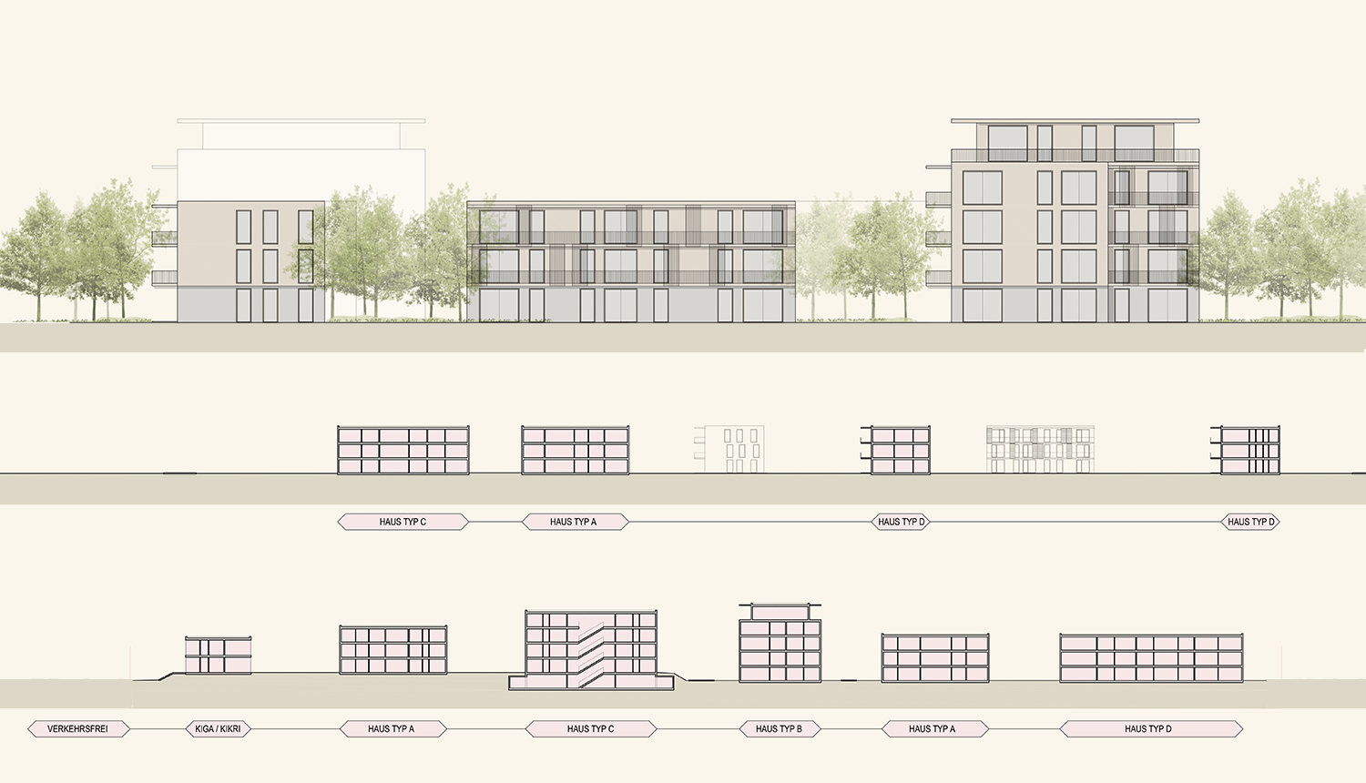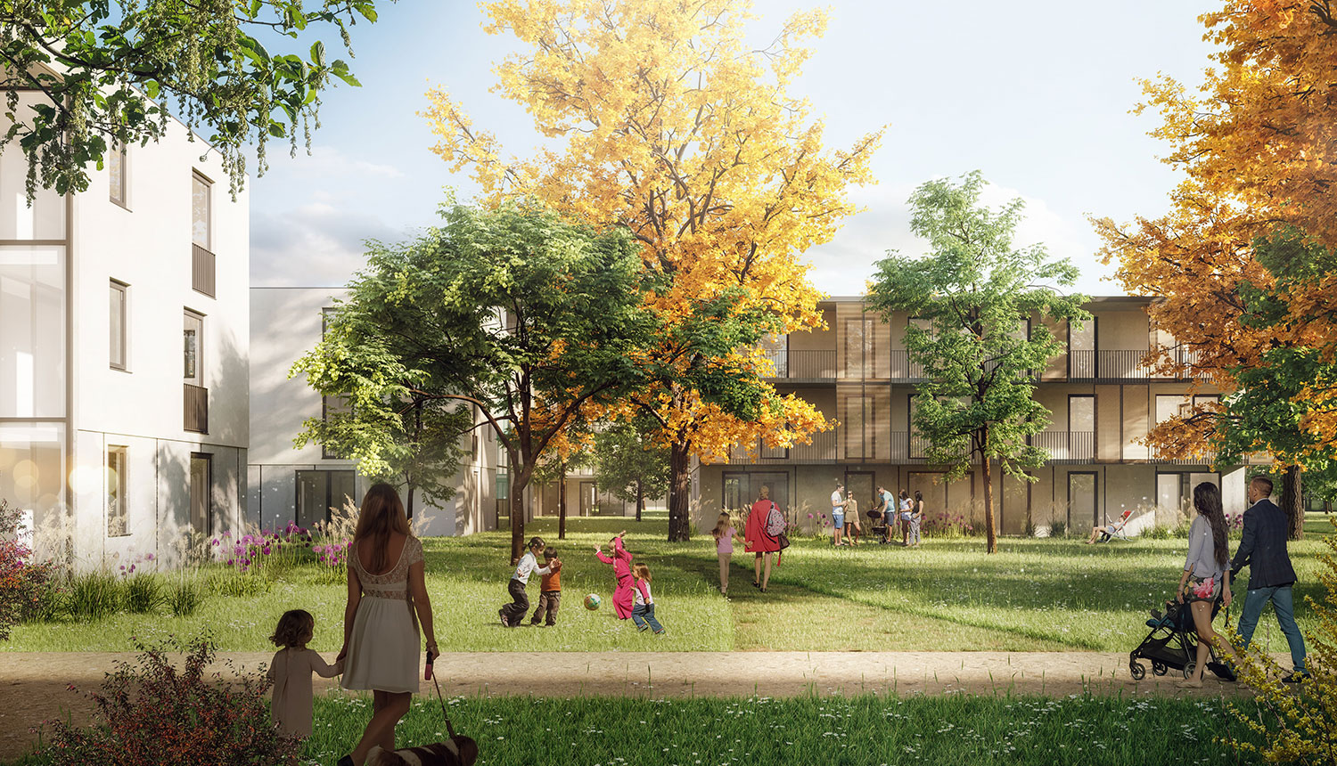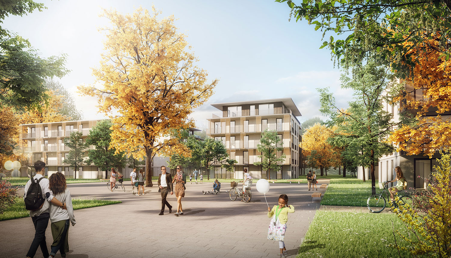 Das Bebauungskonzept sieht eine Entwicklung der Gesamtanlage auf sechs Baufeldern vor, die in Bauabschnitten im Zeitraum von etwa 10-15 Jahren errichtet werden sollen. Dabei ist geplant, 315 Wohnungen zu realisieren. Zwei der Baufelder sind dem Kindergarten/Kinderkrippe sowie einer Bildungseinrichtung gewidmet. Die Baufelder sollen von Südwesten aus entwickelt werden. Die einzelnen Baufelder bilden großzügige, begrünte Höfe, die mit Spielplätzen, Grillplätzen, Aufenthaltszonen und Nutzer*innengärten den Wohnraum erweitern und die nachbarschaftliche Kommunikation fördern. In den Erdgeschosszonen der Häuser sind Gemeinschaftsräume und Fahrradwerkstätten integriert.