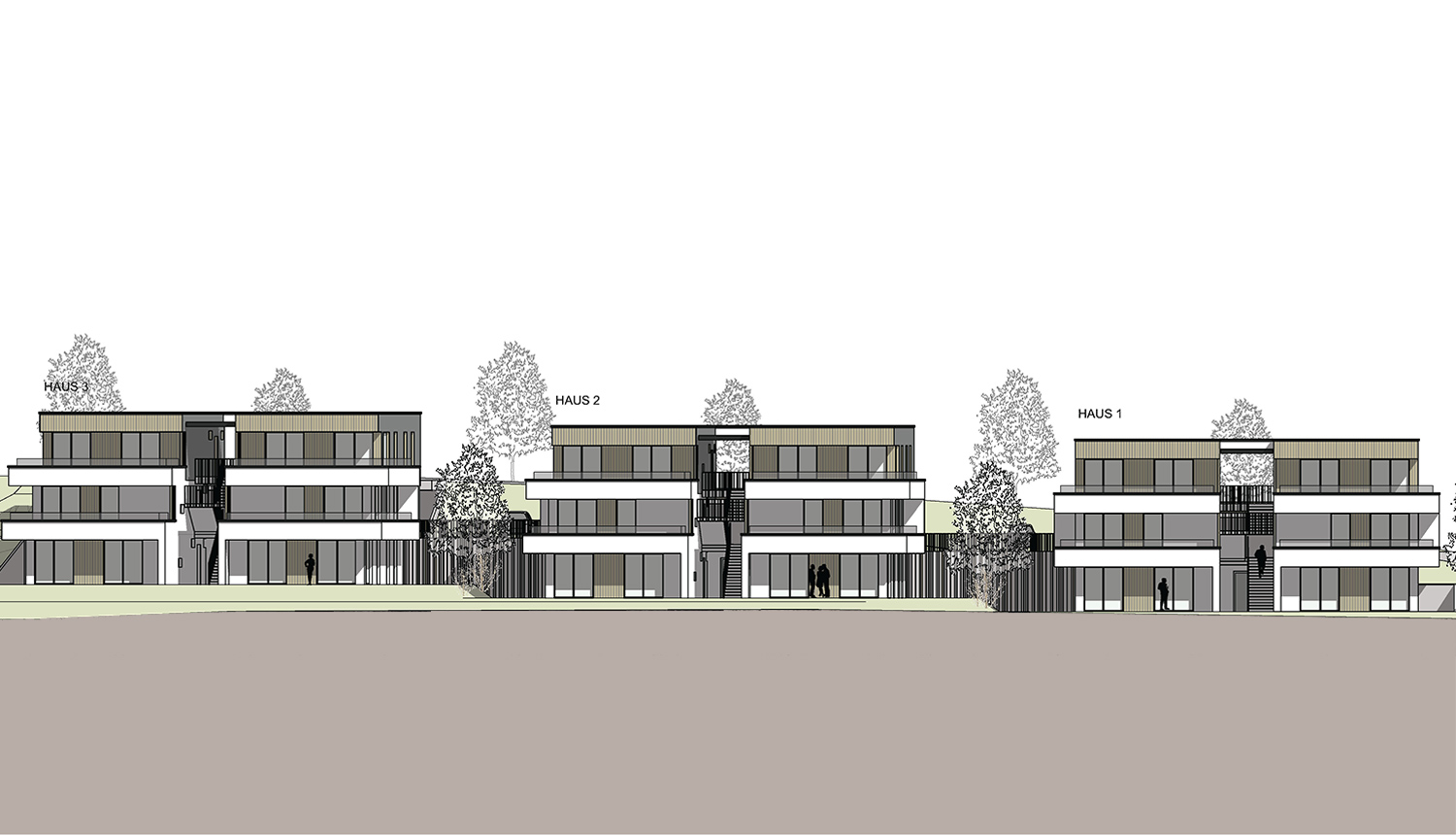 Daraus resultiert eine nach Süden orientierte Bebauung, die im Wesentlichen aus drei zweihüftig konzipierten Objekten besteht. Die terrassenhausgleichen Wohnbauten weisen eine aufgelockerte, gleichmäßige Architektur auf, die zwischen dem gebauten Kontext und dem Grünraum vermittelt. Die dreigeschossigen Stufenbauten stehen in einer fein angeordneten Konfiguration und ermöglichen dadurch bestmögliche Lichtverhältnisse in den Wohneinheiten.