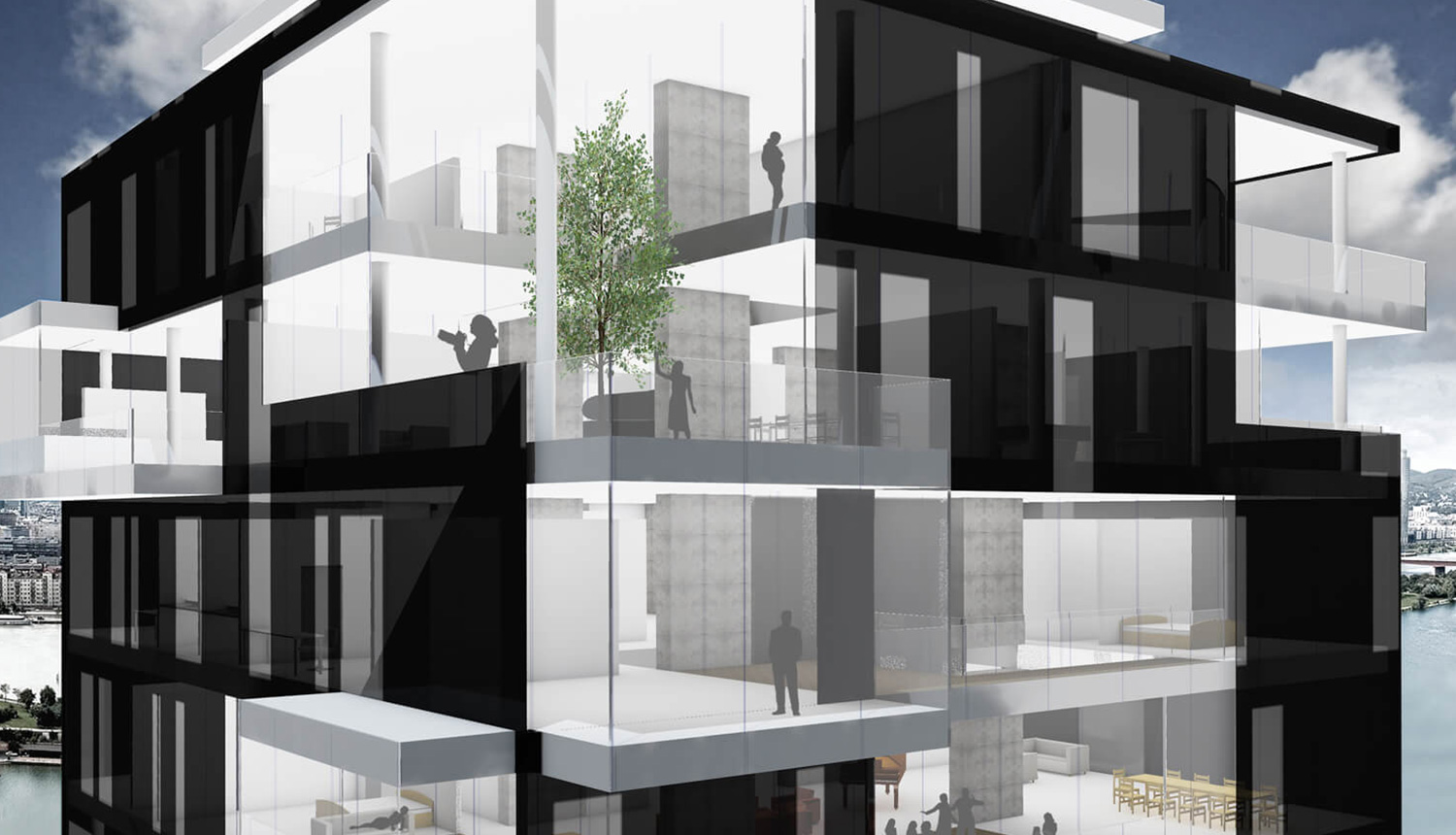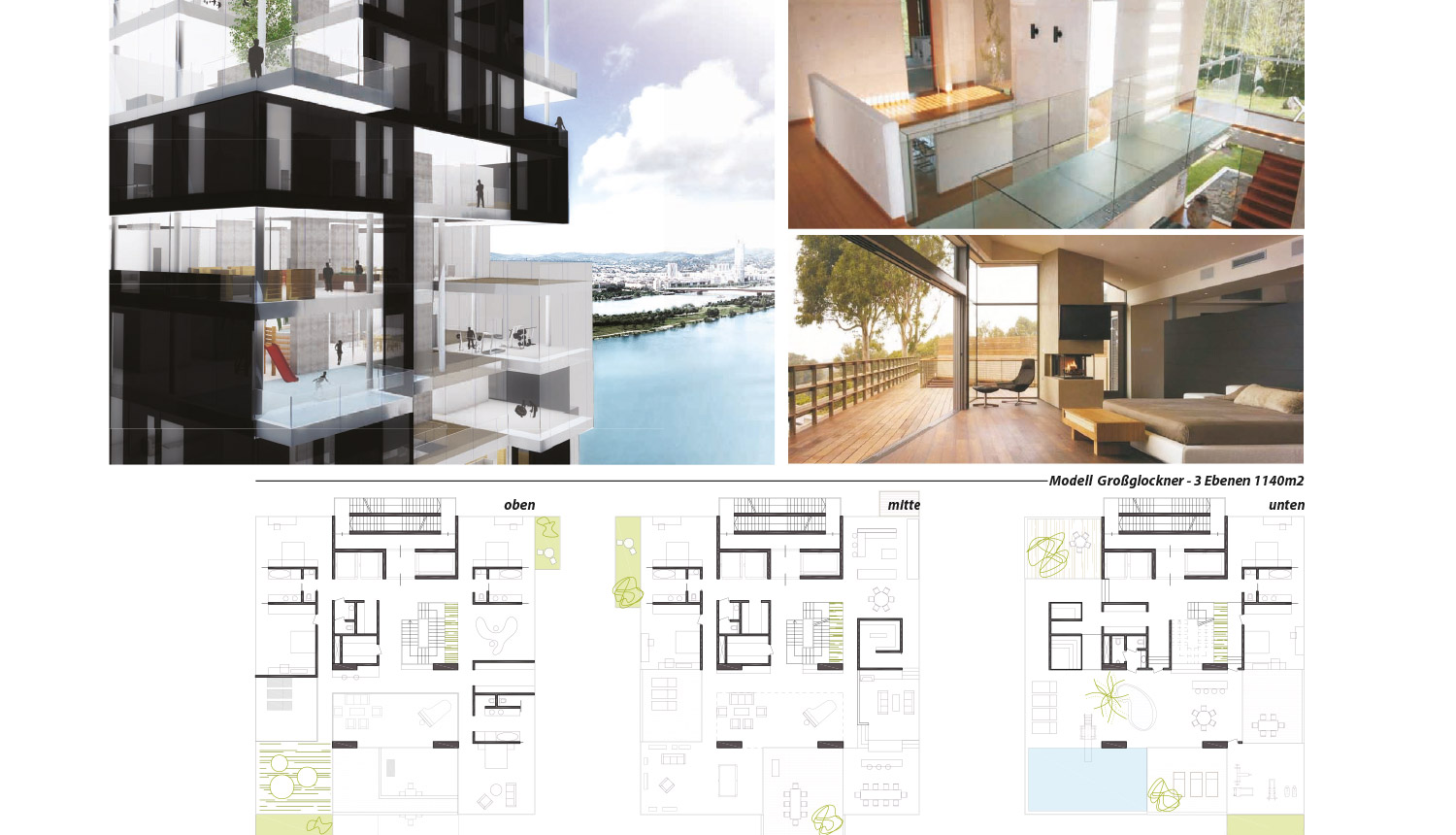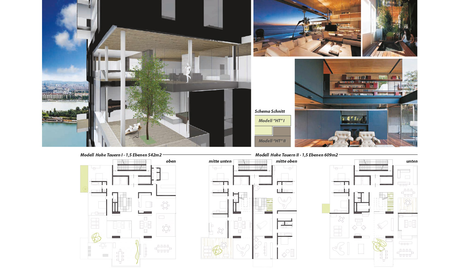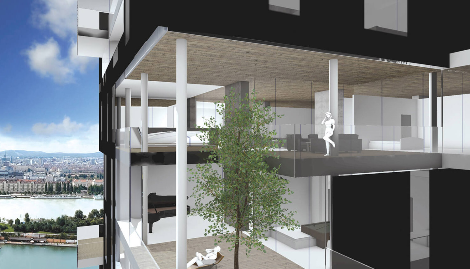 Dieses Konzept eröffnet einen innovativen Zugang zum Hochhaus, indem es den Raum für ein grenzenloses Wohnerlebnis erobern möchte. Die archaische Sehnsucht des Menschen nach dem Licht steht im Mittelpunkt dieses Ansatzes. Wintergärten und Terrassen, großzügig in die Wohnlandschaft integriert und mit atemberaubender Aussicht, verwandeln den Alltag in ein einzigartiges Erlebnis. Die Wohnform „Villa am Geschoß“ – Urban Loft – verknüpft höchste Lebensqualität in zentraler Lage mit den Annehmlichkeiten einer direkten Vernetzung zu den Attraktionen des Stadtkerns.