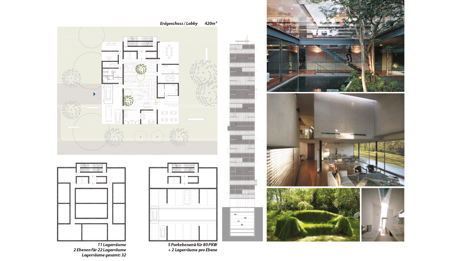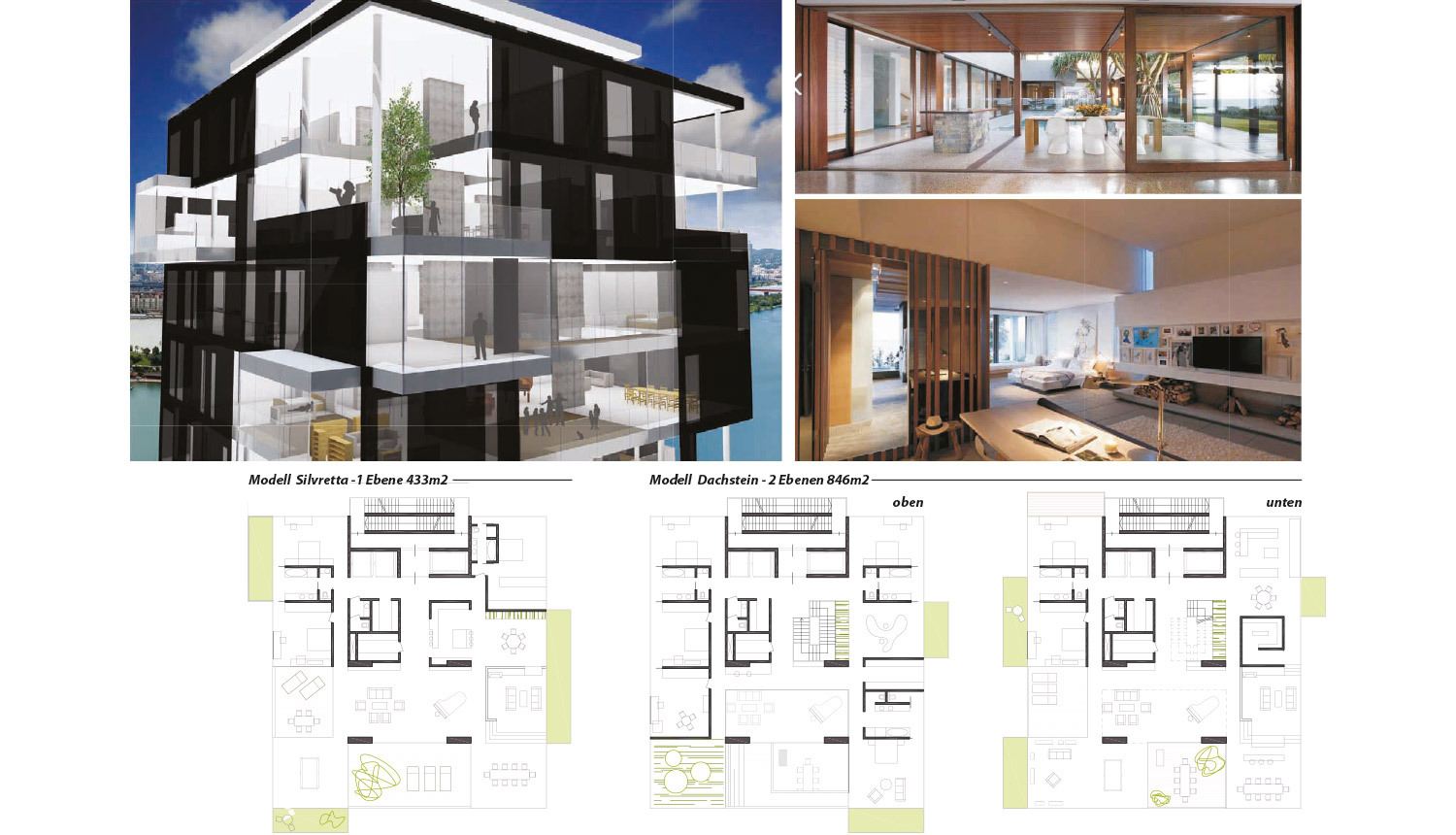Durch großzügige, geschoßübergreifende Grundstrukturen inszenieren sich hier Wohnparks über zwei oder sogar drei Ebenen. Großzügigkeit und höchste Qualität sind dabei zentrale Anliegen. Um ein energieverlustarmes Gebäude zu gewährleisten, erhalten alle Wohneinheiten durch kontrollierte Wohnraumlüftung eine optimale Frischluftqualität. Die Integration von Solarpaneelen und Photovoltaikelementen in der Fassade trägt zur Energieeffizienz bei. Ein sekundäres Energiekonzept ermöglicht dem Gesamtobjekt einen autarken dreijährigen Energiehaushalt.