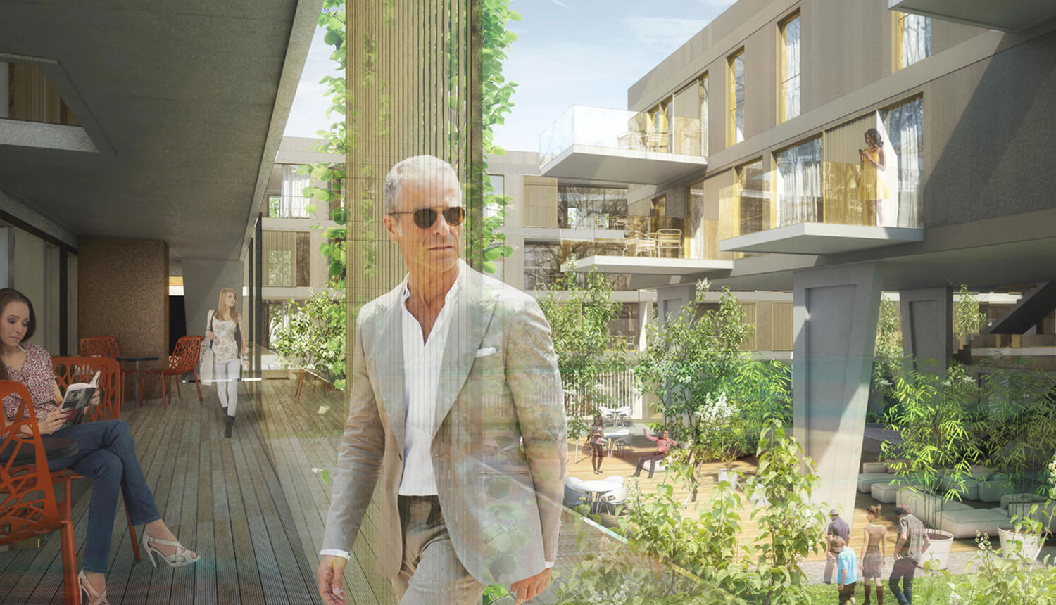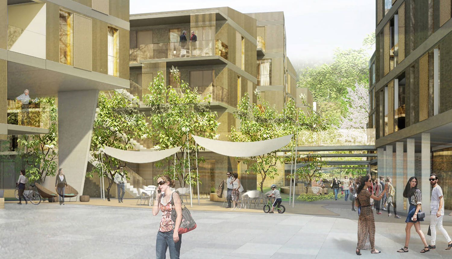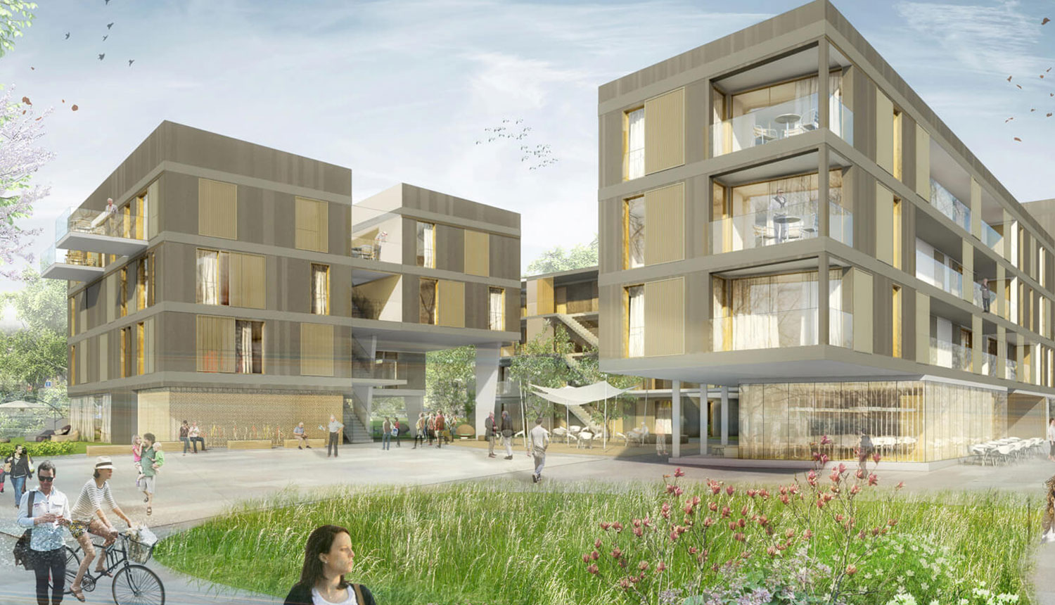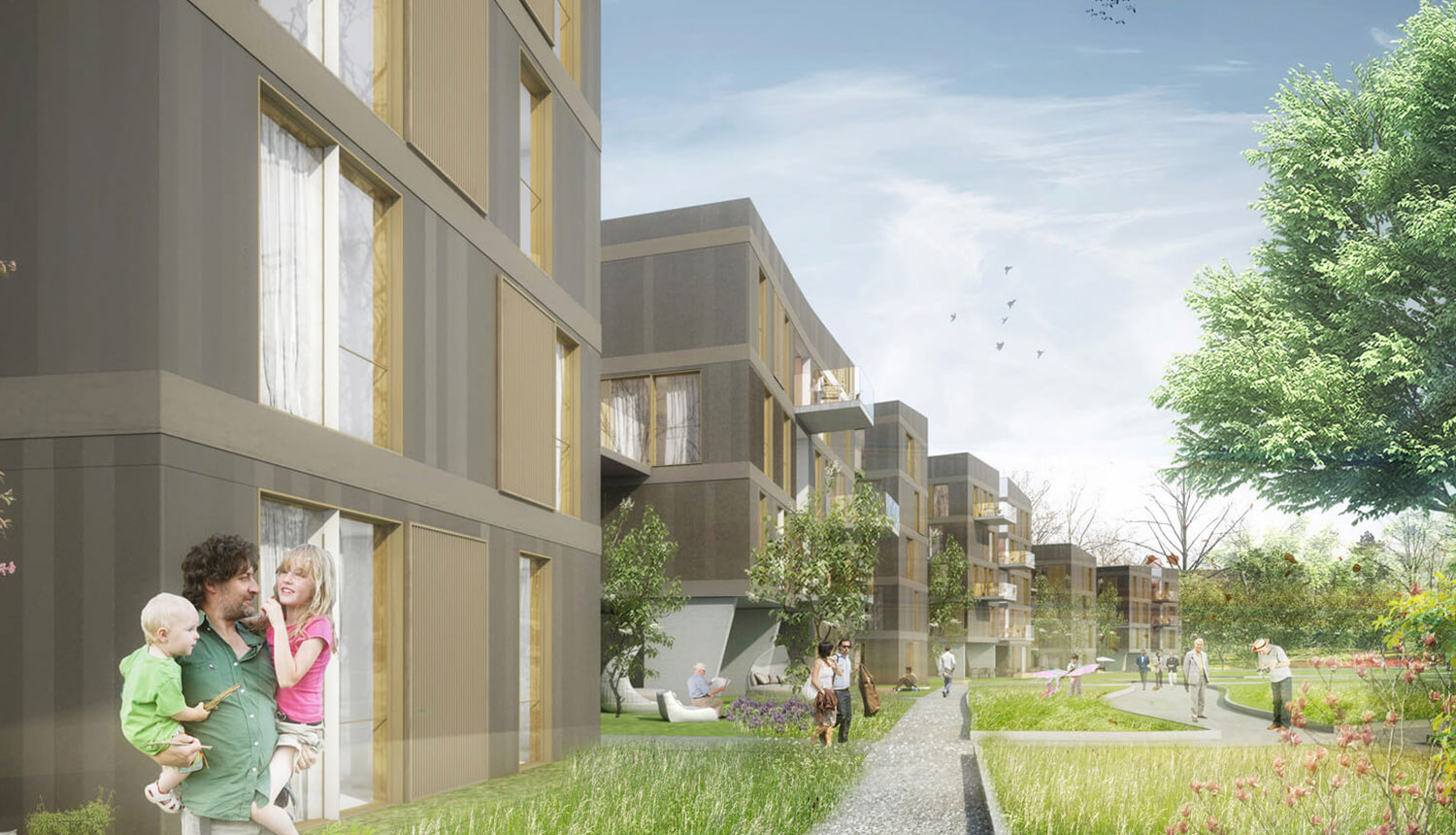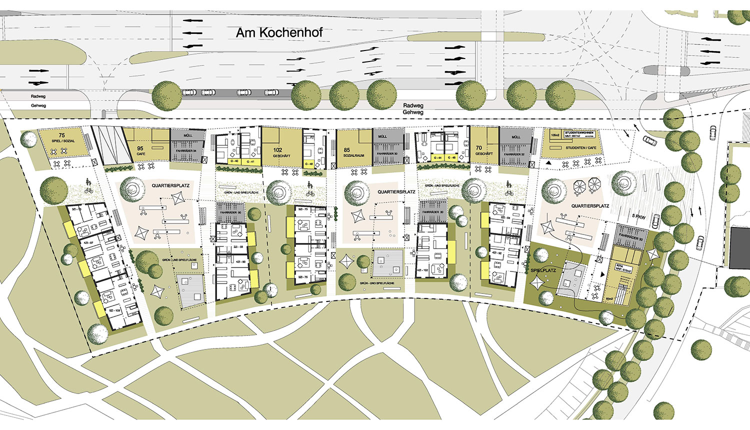 Es wurde eine offene Mitte als urbane Ergänzung der umliegenden Strukturen konzipiert. Diese kommunikative Aufwertung ermöglicht eine Vernetzung der unterschiedlichen Wohnformen und bringt hohe Qualität für ein funktionierendes Zusammenleben mit. Durch das Wechselspiel in der Anordnung der Baukörper entstehen Außenräume unterschiedlicher Stimmung und Funktion.