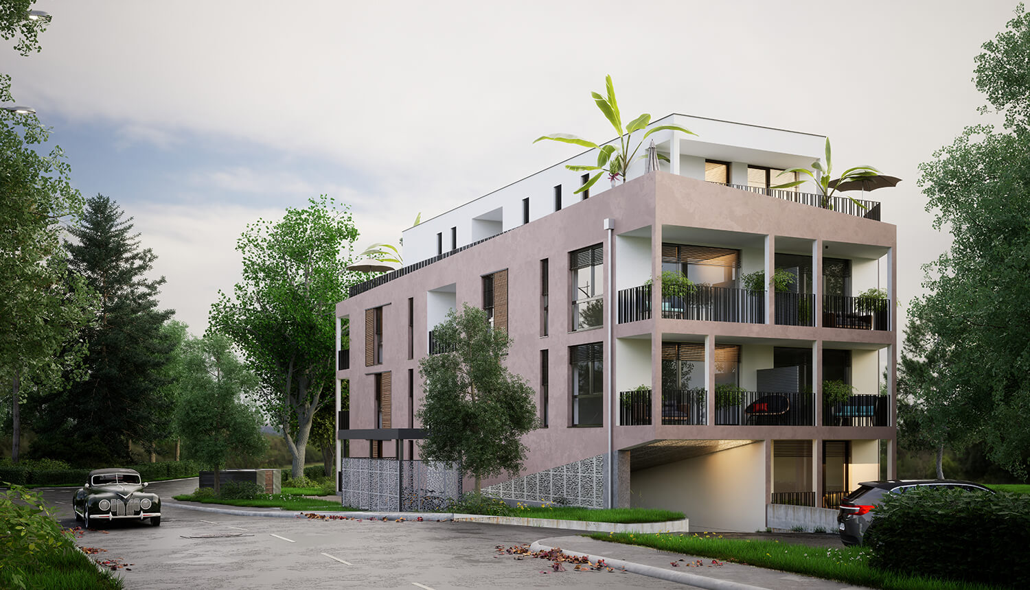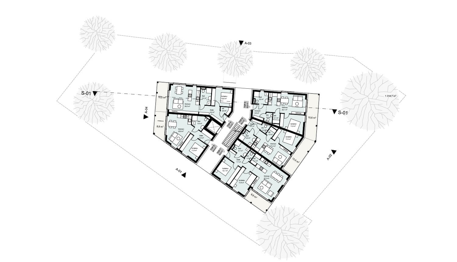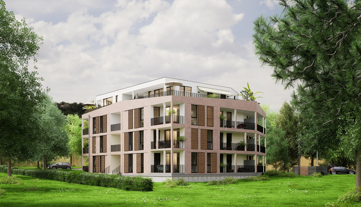 Das Prinzip der natürlichen Barriere wird von der straßenseitigen Schauseite des quaderförmigen, mehrgeschossigen Baukörpers aufgenommen, reflektiert und an die städtebaulichen Anforderungen angepasst. Daraus resultiert eine geschlossene und eher ruhig gestaltete Front- und Rückseite, die von Veranden aufgelockert wird und zugleich dem Objekt einen plastischen Touch verleihen. Die Idee der Plastizität wurde weitergeführt und drückt sich in der Fassadengestaltung aus, die an die villenartige Formulierung des ursprünglichen Bestandsgebäudes erinnert. Diese Lebhaftigkeit in Kombination mit der schlichten Ausführung vermittelt eine besondere Attraktivität und schafft zugleich qualitative Räume.