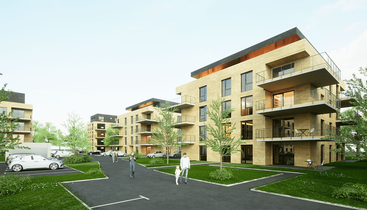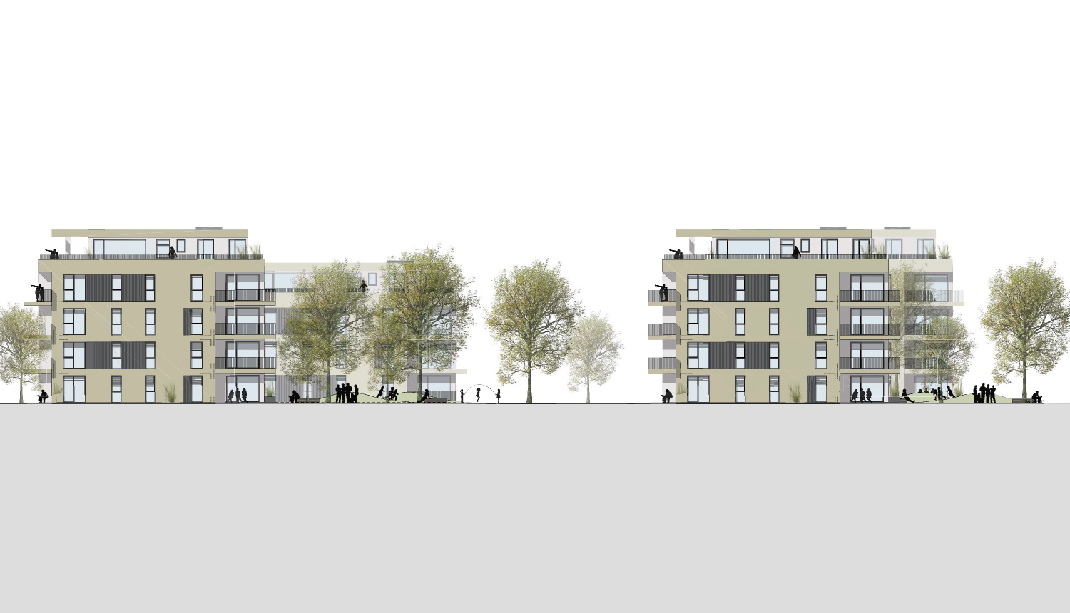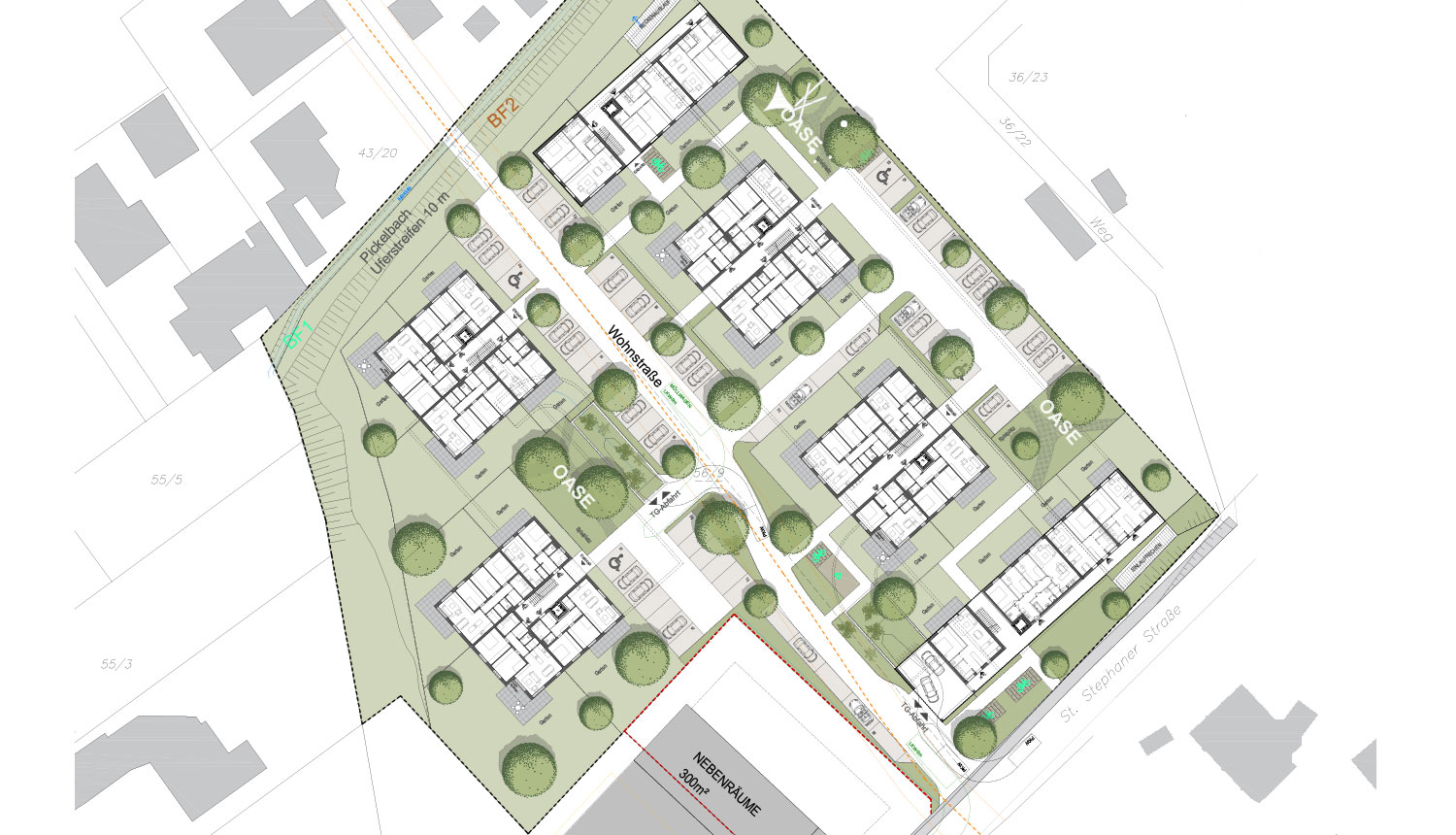 Besonderes Augenmerk wurde auf die konsequente Formulierung der Außenräume gelegt. Durch die Anordnung der Baukörper ergeben sich Außenräume unterschiedlicher Qualität und Stimmung – vom privaten Garten über den gemeinsamen Hof mit zugeordneten Kleinkinderspielplätzen bis zur zentralen Wohnstraße als kommunikatives Rückgrat der Gesamtanlage. Diese Konzeption ermöglicht eine Vielfalt unterschiedlicher Qualitäten im direkten Wohnumfeld und die kommunikative Verflechtung der Außenräume mit der Gesamtanlage.